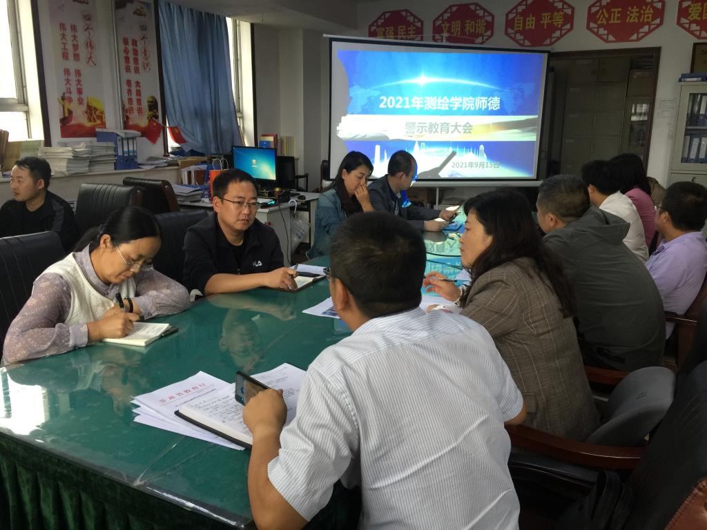 为全面贯彻习近平总书记关于教育的重要论述和全国教育大会精神,引导广大教师坚定理想信念、厚植爱国情怀、涵养高尚师德,以为党育人、为国育才优异成绩庆祝中国共产党百年华诞,根据《教育部关于在教育系统开展师德专题教育的通知》(教师函【2021】3号)精神,按照《甘肃工业职业技术学院师德警示教育活动实施方案》的安排,测绘学院于2021年9月15日举行第二次师德警示教育专题会议。会议由党委委员副校长王利军主持,测绘学院全体教师参加。