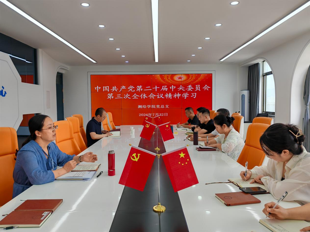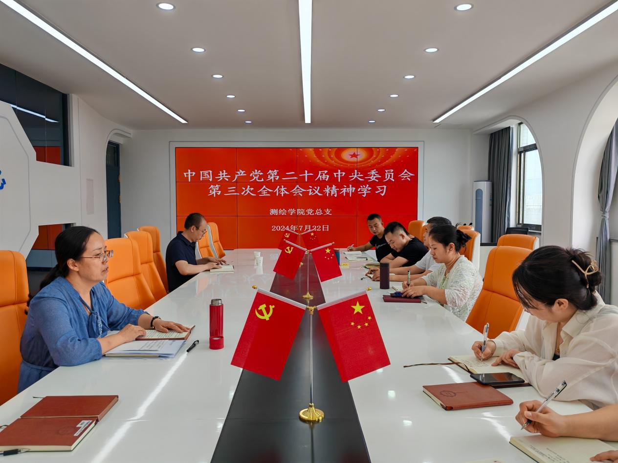 7月22日下午,测绘学院党总支召开专题会议,认真学习贯彻党的二十届三中全会精神,深入学习领会习总书记重要讲话,并进行了深入思考和热烈讨论,掀起了一股理论学习的热潮。会议由测绘学院党总支书记杨爱琴主持,全体党员同志共同参与。