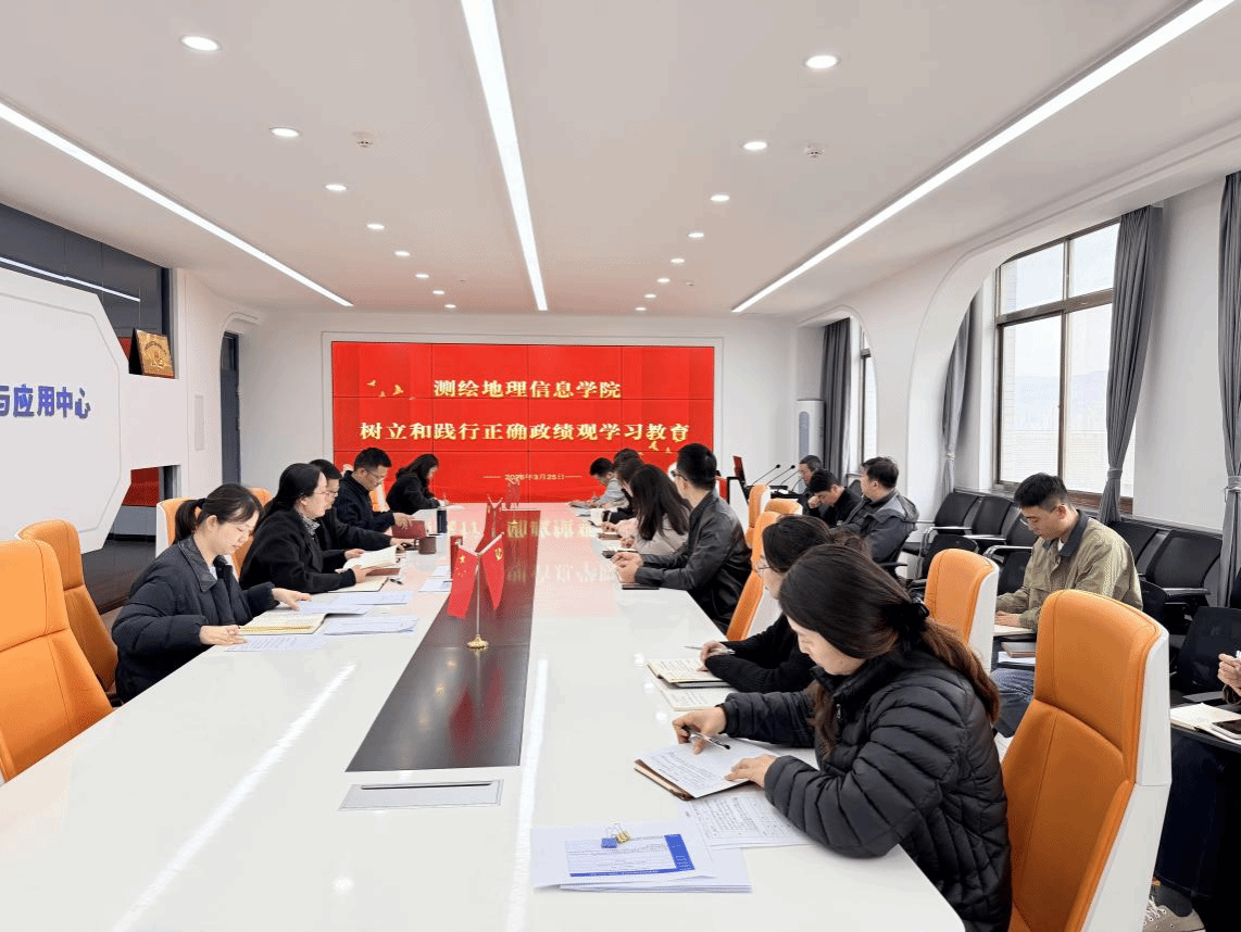 为深入学习贯彻习近平新时代中国特色社会主义思想,引导全体教师牢固树立和践行正确政绩观,推动学院事业高质量发展,2026 年 3 月 25 日下午,测绘地理信息学院在高分中心会议室召开 “树立和践行正确政绩观学习教育” 专题会议,学院领导班子及全体教师参加学习。
