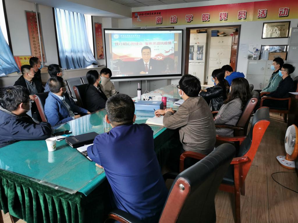 4月15日下午,测绘学院全体教师观看了学校组织的“全校教职工同上一堂思政大课”网络课直播。本次讲座的主题为“践行初心担使命 聚焦思政抗疫情”,分别由校党委书记杨声教授和校党委副书记、校长曹爱明研究员作主讲。